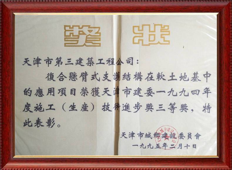 1995年天津市技術(shù)進(jìn)步三等獎(jiǎng)(復(fù)合懸臂式支撐)