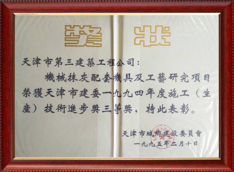 1995年天津市三等獎(jiǎng)抹灰機(jī)具及配套工藝研究