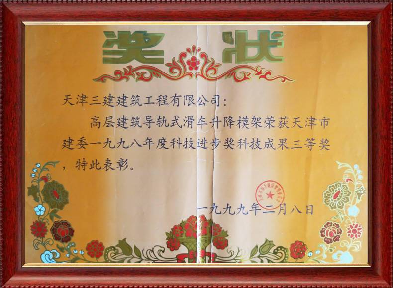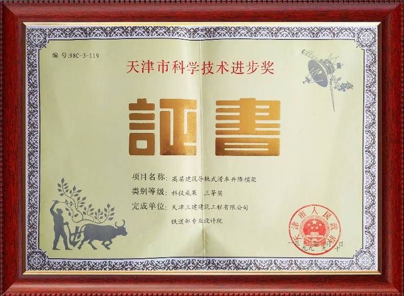 1999年天津市政府科學(xué)技術(shù)進(jìn)步獎(jiǎng)三等獎(jiǎng)(高層建筑導(dǎo)軌式滑車升降模架...
